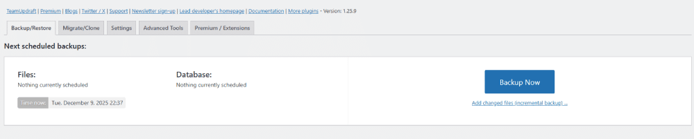 Our preference is to use the server control panel to run the backups. This should mean that the backup routine is less likely to be affected by plugin conflicts etc and also there’s one less plugin to have running.